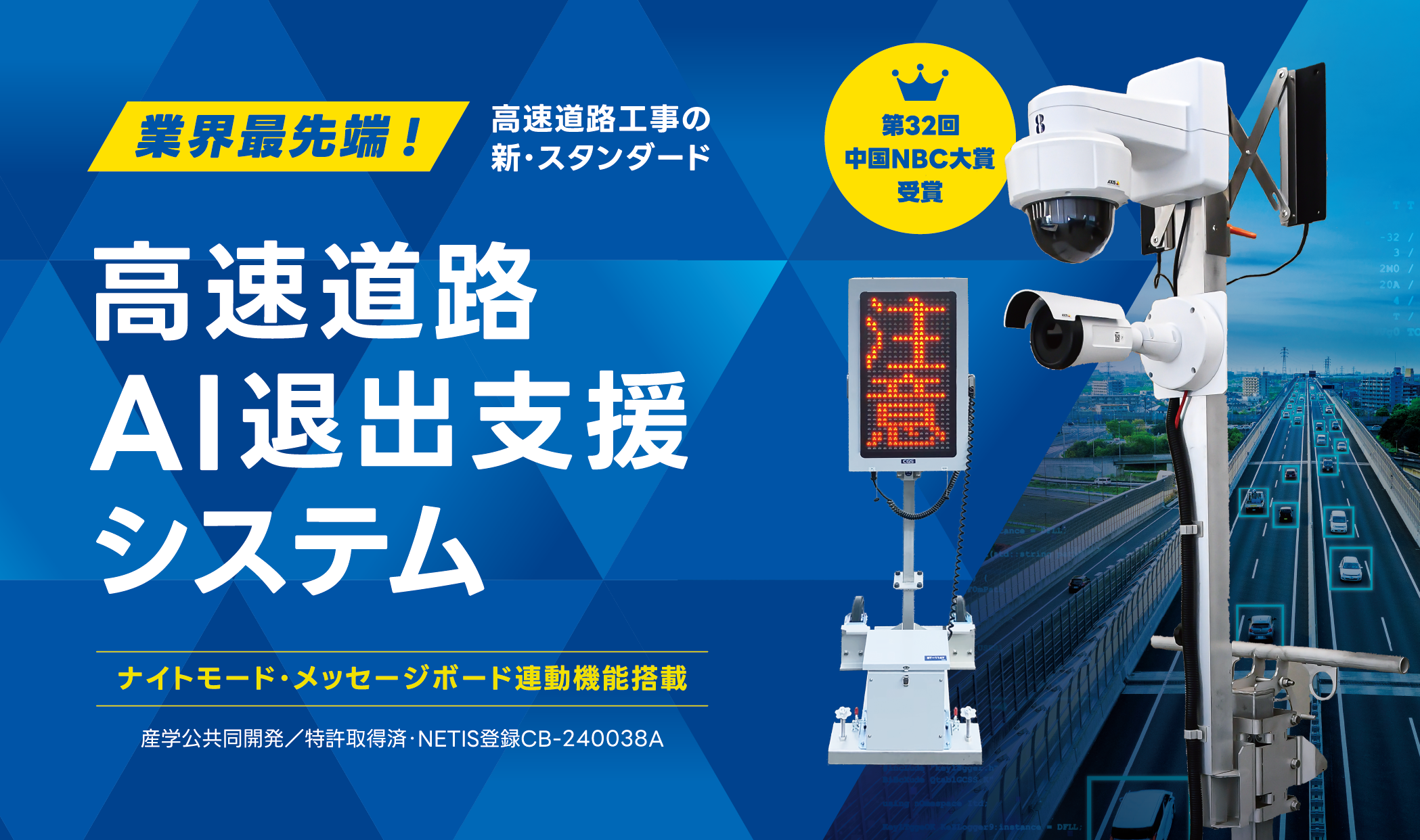 事故の起こりやすい高速道路の「工事車両の退出時」に、業界最先端となる「AIを活用した退出支援システム」を導入することで、高速道路作業中のヒューマンエラーによる事故を未然に防ぎ、安心で安全な工事車両の退出を可能にしました。